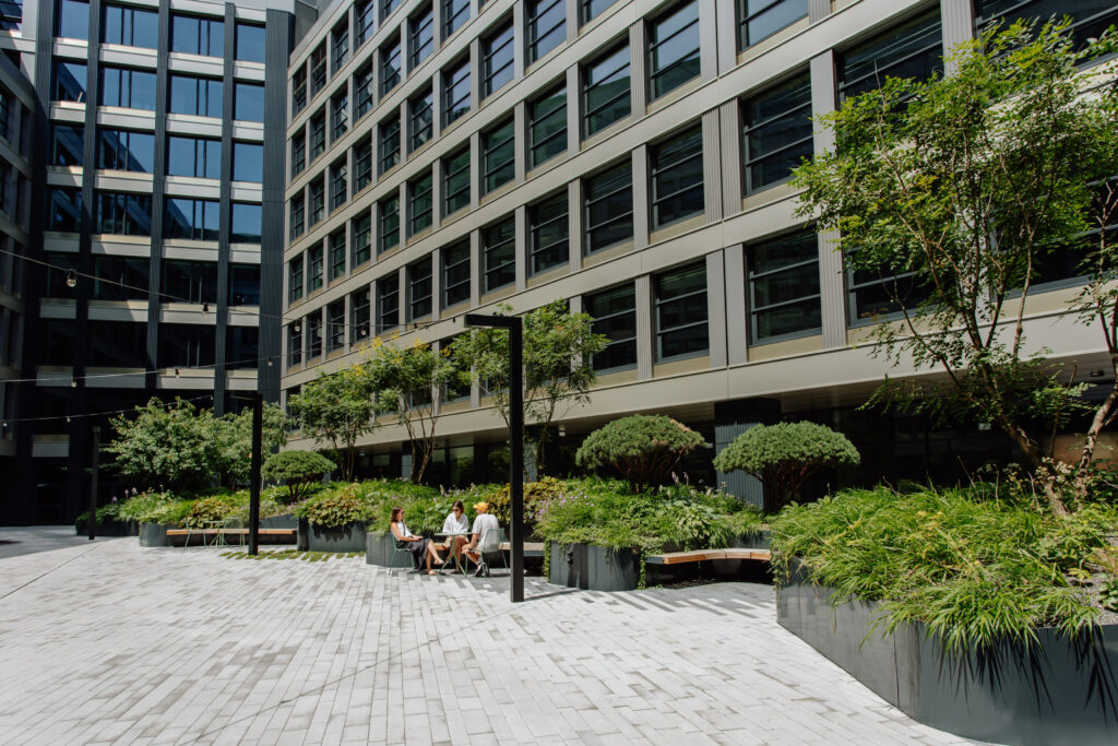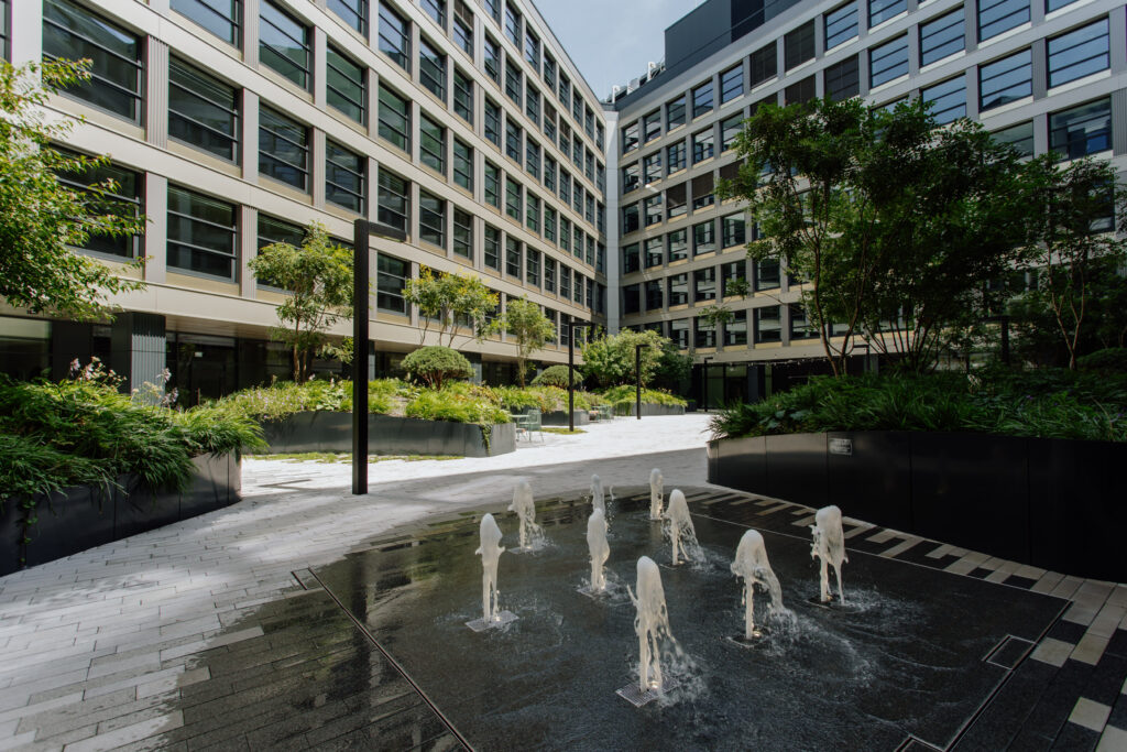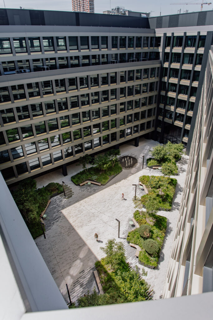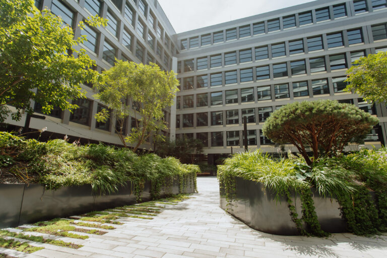 V srdci rušnej biznis budovy sa ukrýva oáza pokoja. Zavŕšené kolonádou stĺpov a obklopené zeleňou, toto miesto s vodným elementom ponúka ideálny únik od zhonu dňa. Vkročte do zeleného átria a nechajte vašu myseľ na chvíľu vypnúť.