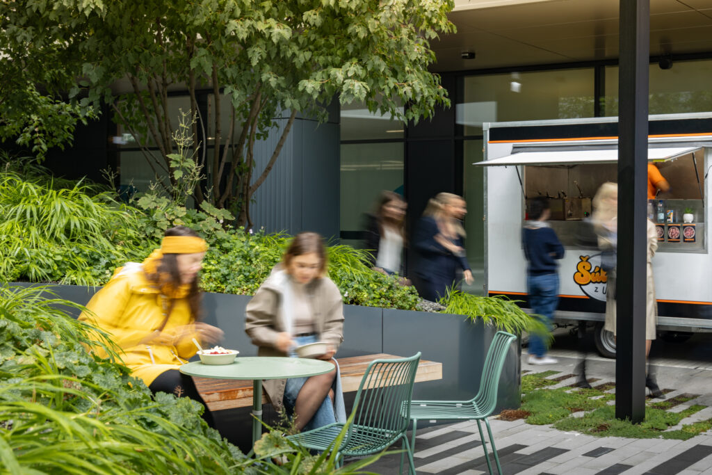 Záleží nám na tom, aby ste sa cítili dobre. Zastavte sa v zelenom átriu – ideálnom mieste na krátku pauzu alebo posedenie s kolegami. Ponúkame aj pestrú paletu eventov ako joga, pilates či meditácie, ktorými sa staráme o vaše duševné i fyzické zdravie.